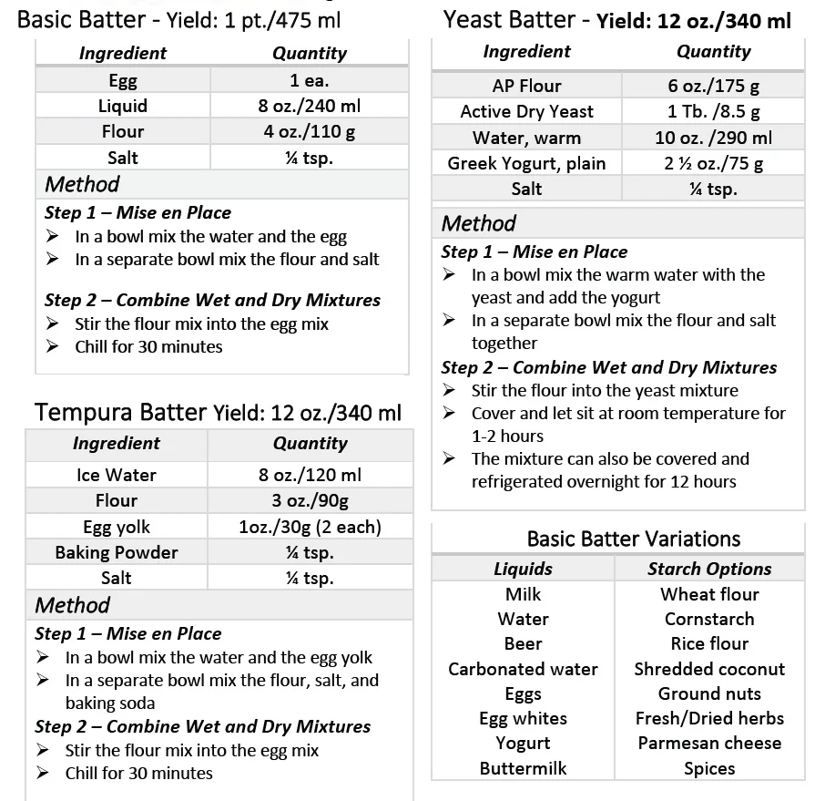 Savory or sweet batters prepared from flour and liquids serve a similar purpose as bread crumb coatings. They enhance flavor, seal in moisture, and provide a crunchy texture to foods. Batters can be thin and light like Japanese tempura, or they can be thicker like a buttermilk or beer batter. Many different starches and liquids can be used for batters. Leavening agents including eggs, whipped egg whites, baking powder, or yeast are sometimes added to lighten the batter.