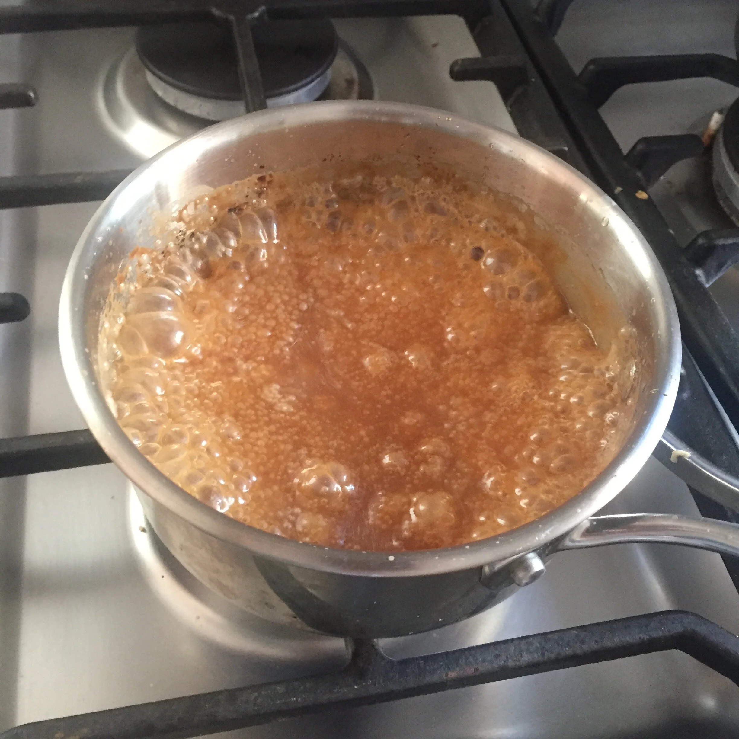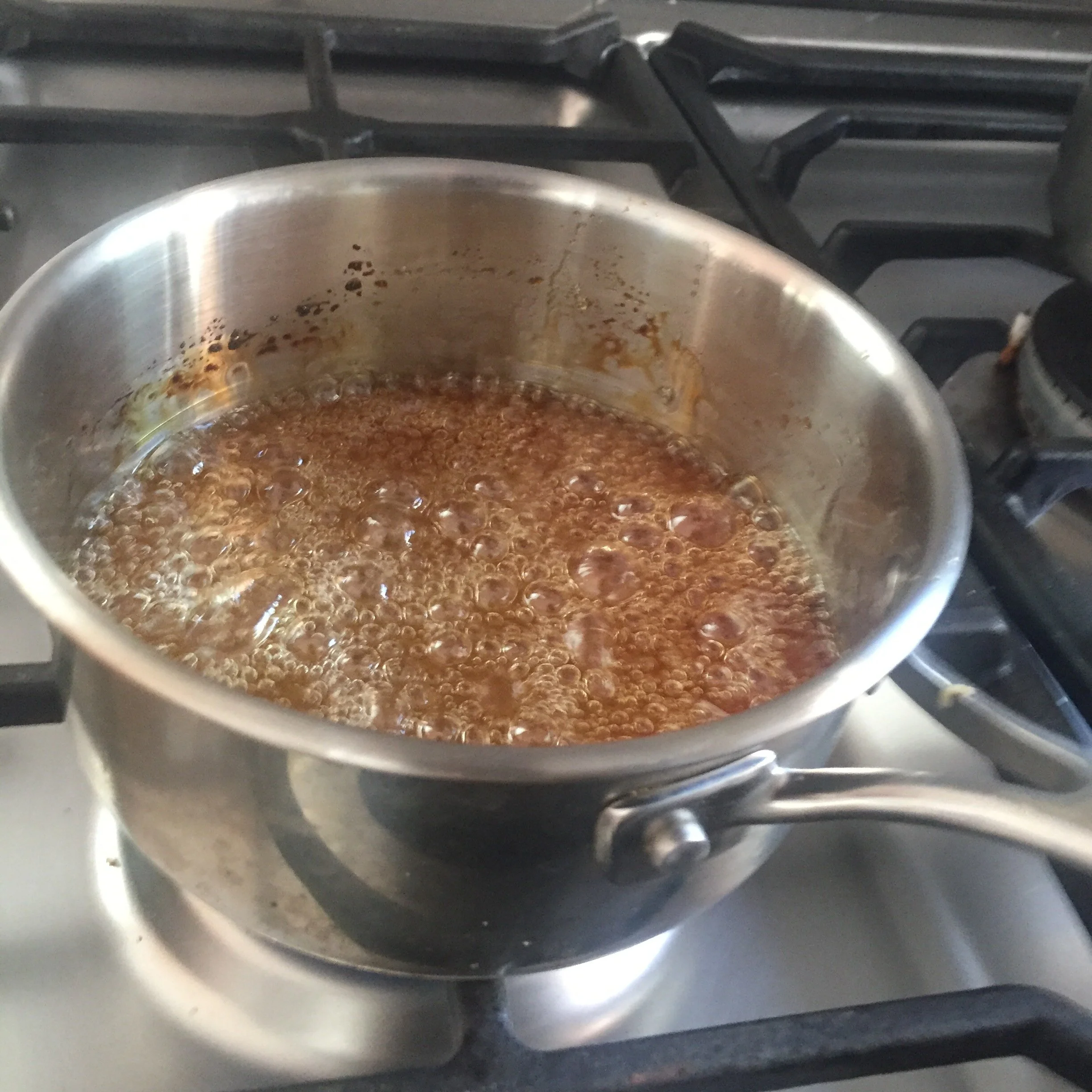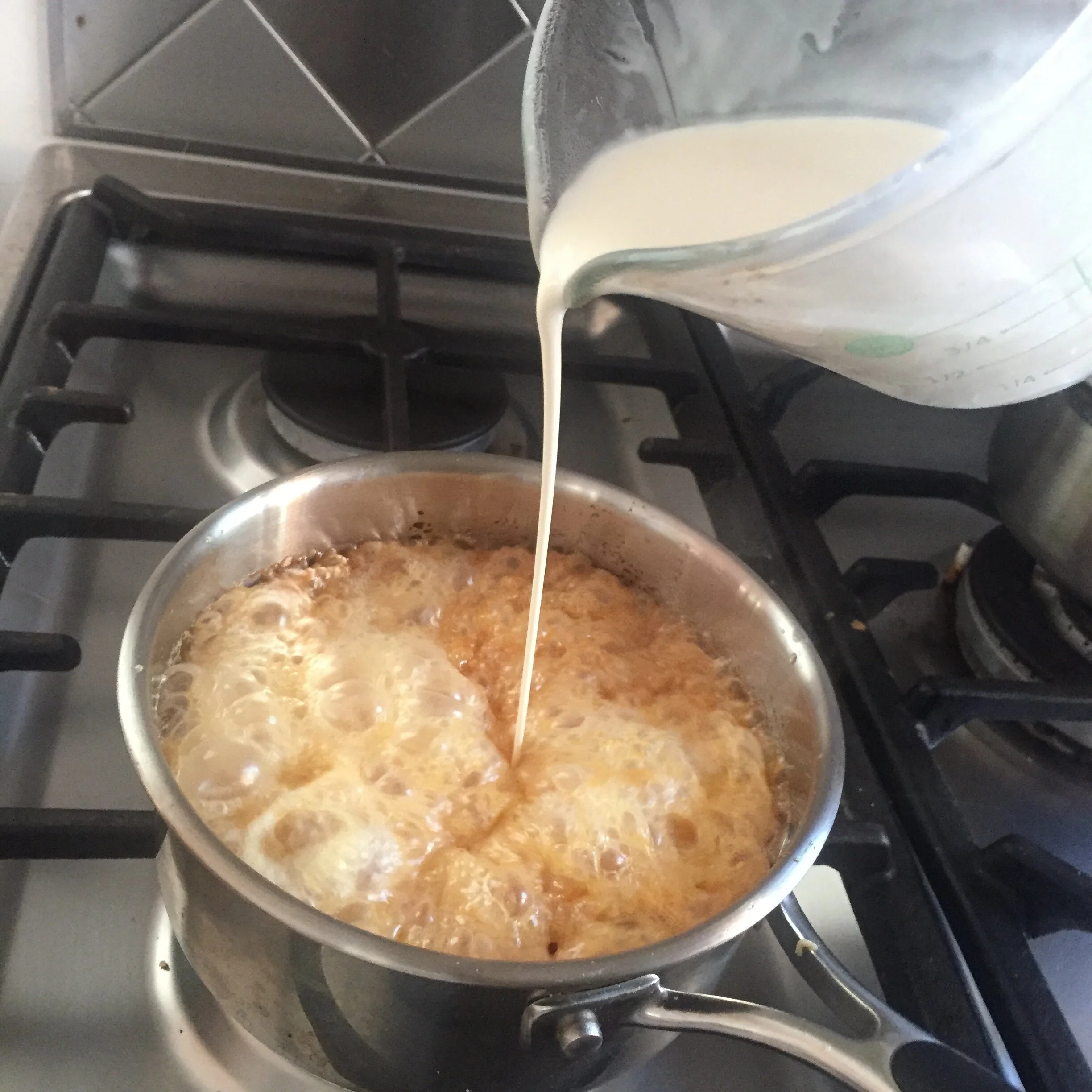 When the sugar has reached an amber color, remove it from the heat and whisk in the cream and butter