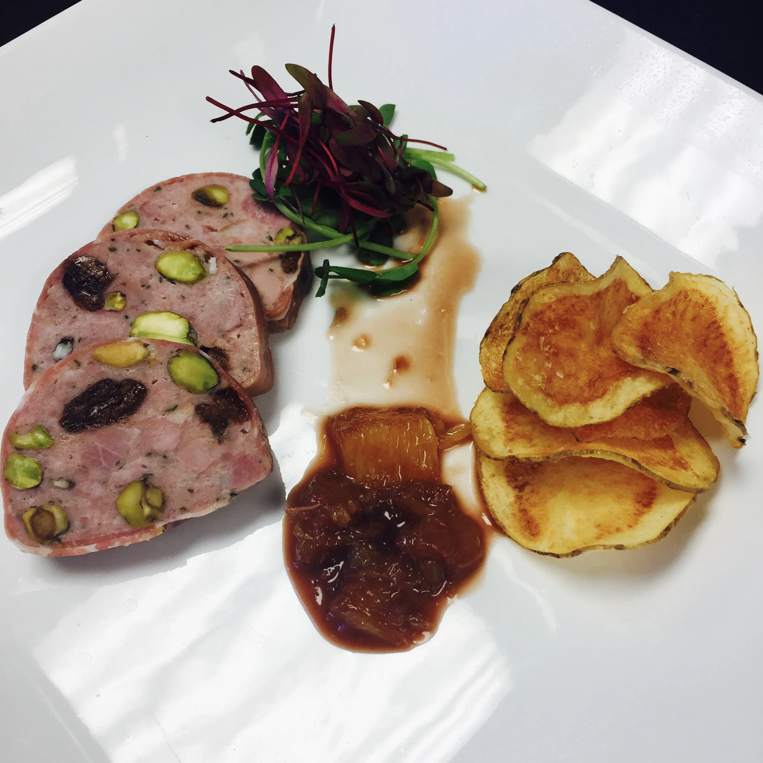 From a term for the earthenware dish that was traditionally used for the preparation of a terrine. Today, the practical terminology of terrines and pâtés is often interchangeable. Terrines can be prepared with a forcemeat, molded foie gras, or layered vegetables bound with aspic or fresh cheese.
