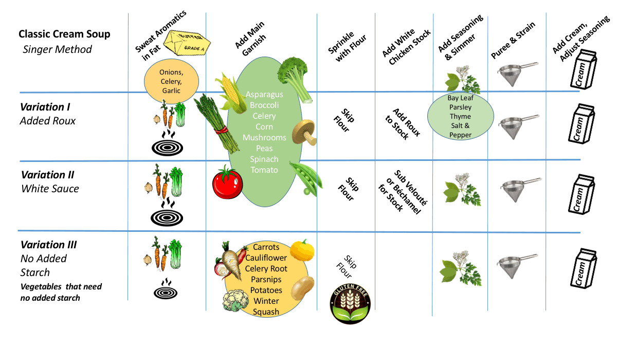 The classic method for preparing a cream soup starts with a flavor base of aromatics of onions, celery, and/or garlic with the main ingredient (for example asparagus, cauliflower, or mushrooms)that is cooked in fats including butter or oil. For the singer method, sprinkle flour over the vegetables and fats after they have softened to create a roux, a white stock is then added along with a sachet d'epice. The soup is simmered and seasoned, pureed and strained, and returned to the pot where it is finished with cream.