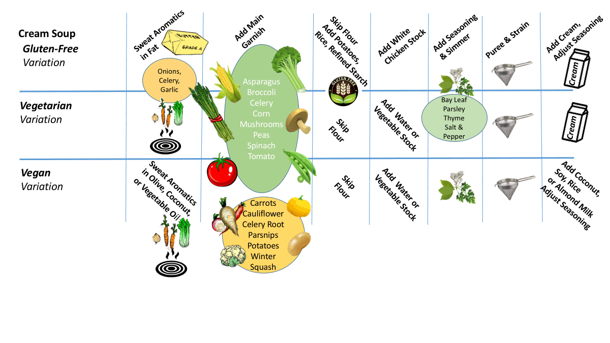 Vegetarian and Vegan versions are made by preparing the soup with a vegetable stock and eliminated animal fats by using oils and non-dairy milk or cream including coconut, soy, rice, or almond.