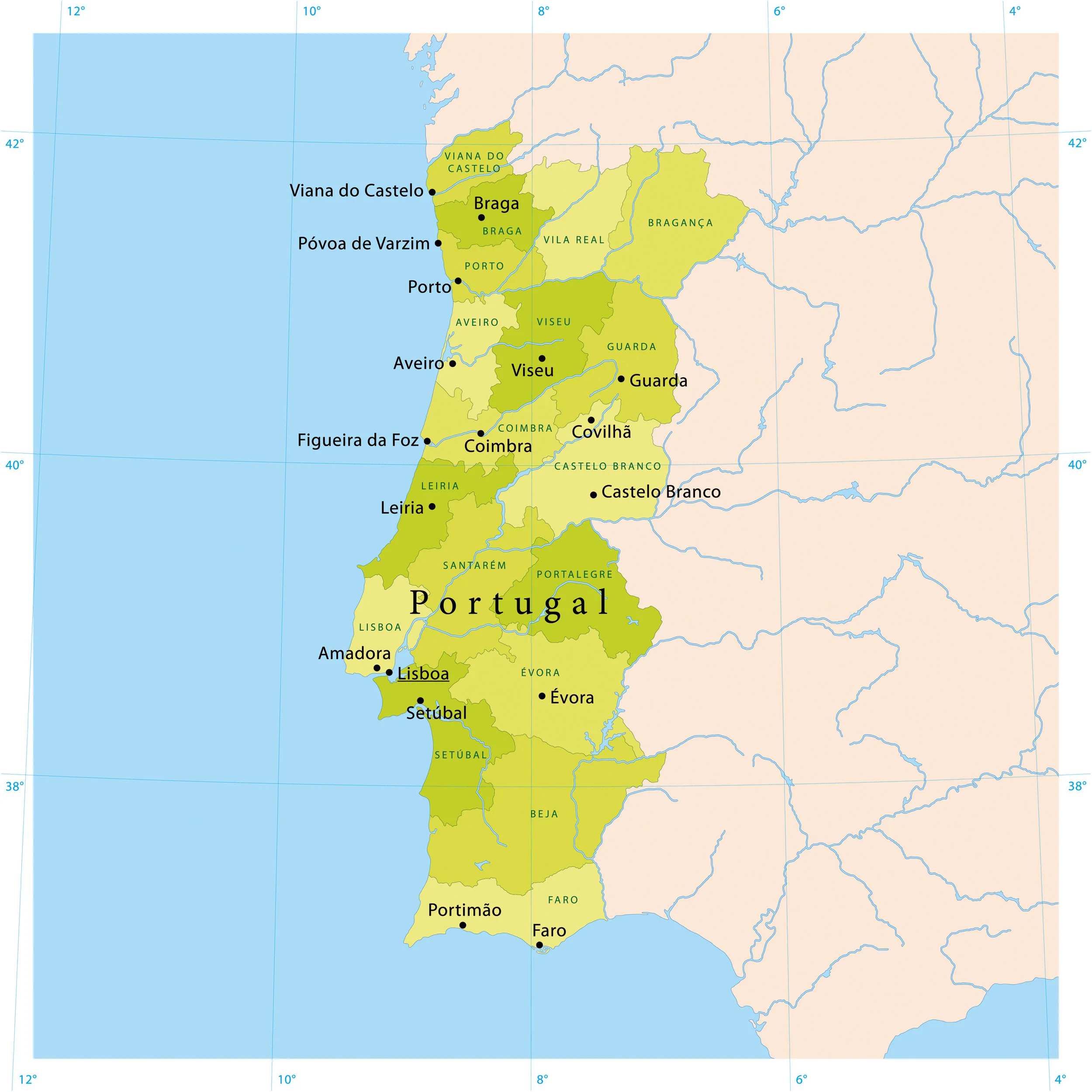 Portugal, located on the southwestern Iberian Peninsula, faces the Atlantic coast to the west and south, and Spain on its east and northern borders. In the mountainous north, conditions are generally cooler and wetter with regular snowfall in winter. Along the coast towards the city of Lisbon, a Mediterranean climate including long, hot summers prevails. The volcanic islands of the Azores and Madeira, autonomous regions located in the Atlantic Ocean west of Portugal, have moderate Mediterranean climates as well.
