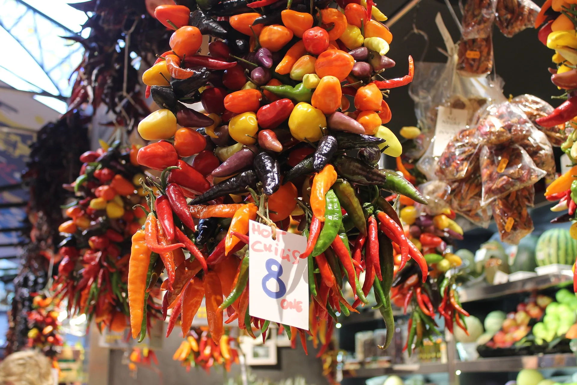 Seafood beef, lamb, pork, goat, salt cod, dry cured sausages, and ham