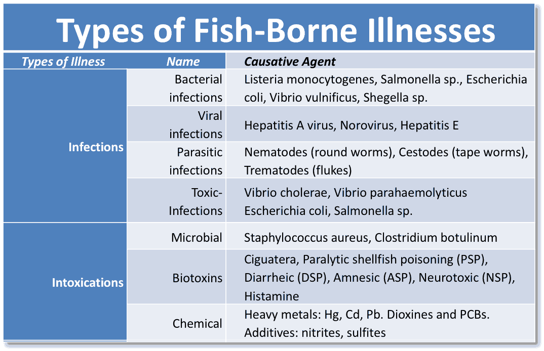 Numerous health concerns are associated with fish and seafood and are compounded by loose and at times confusing regulations related to fish inspection. Eating raw or under-cooked fish and seafood can compound the problem if the product is not handled correctly. Fish-borne illnesses are generally divided into intoxications and infections, and are usually caused by environmental factors, fish handling or the treatment of water. Infections occur from bacteria like listeria, E. coli, and salmonella; viruses like Hepatitis and Norovirus, or parasites like tapeworms. Fish-borne intoxications are created by bacteria like Staph and Botulism, from biotoxins like Ciguatera, or from chemicals like heavy metals and PCB.