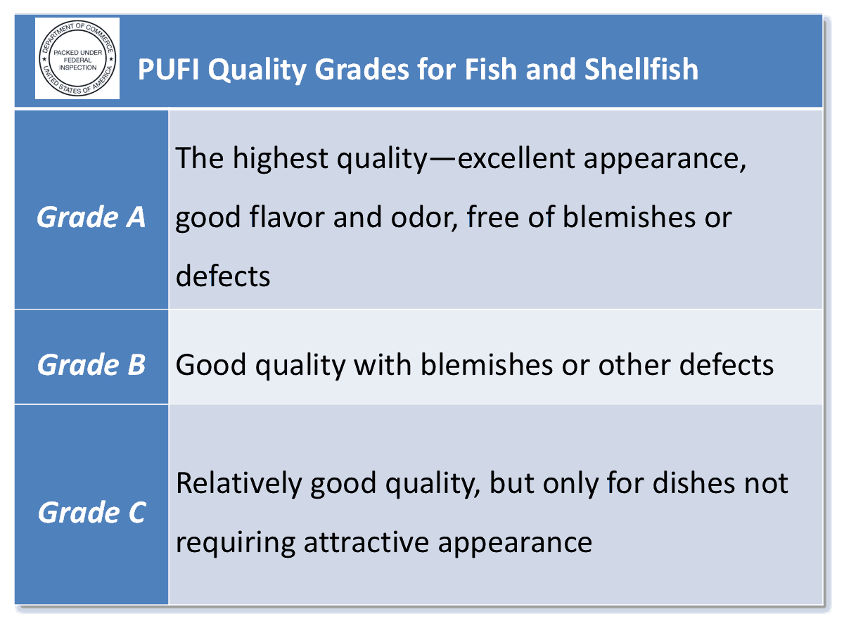 The United States Food and Drug Administration (FDA) is the primary agency responsible for ensuring the safety, wholesomeness, and proper labeling of domestic and imported seafood products. The FDA requires all fish and shellfish processors to develop and implement a Hazard Analysis Critical Control Point (HACCP) plan for their operation. The National Marine Fisheries Service (NMFS), which is part of the U.S. Department of Commerce, conducts a voluntary seafood inspection and grading program. This program, known as PUFI (Packed Under Federal Inspection), is used for fresh, processed, frozen, and canned fish and seafood products. Grading is determined by the process (fresh, canned, frozen) that includes factors such as overall appearance of the fish product, discoloration not characteristic of the species, surface defects on the fish, and cutting, filleting, or boning defects.