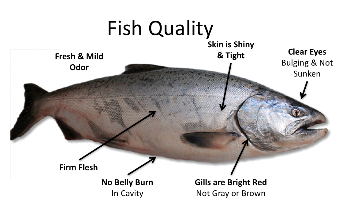 Finding a reliable purveyor to provide superior fish and seafood is important for maintaining quality and consistency in the kitchen. Whether the products are whole, fillets and sides, or portion-cut, look for a firm texture and fresh odor as signs of wholesomeness. Quality factors when purchasing whole fish include a shiny skin that is tight to the carcass, gills that are red or pink and not brown, a belly cavity free of bruises or deterioration (also known as belly burn), and clear, bulging eyes, not sunken or cloudy. Fish often smell fishy because bacteria on the surface of the skin, called trimethylamine oxide (TMAO), breaks down from exposure to oxygen creating an off odor. Sharks, skate, and rays urinate through their skin and can sometimes smell of ammonia. These odors can be counteracted by rinsing the fish and applying acids including lemon, vinegar, or tomato.