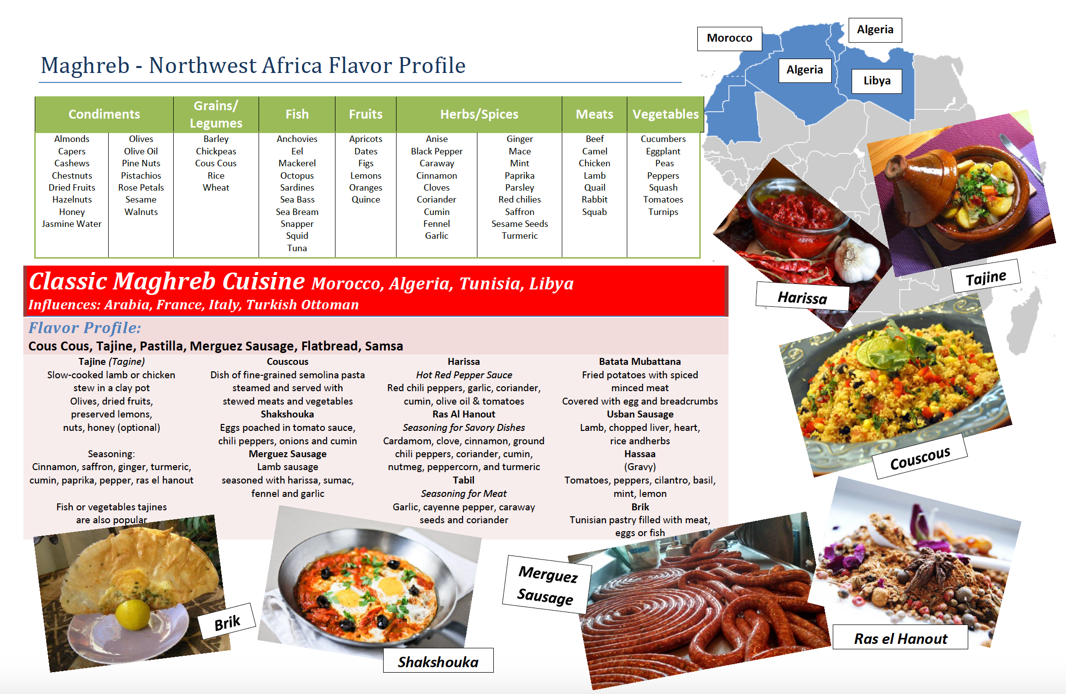 The Berbers were said to have invented couscous, a fine grained semolina pasta and traditional accompaniment to stews found in this region. Flatbreads, known as kesra, are a staple at every meal. The Ottoman Turks brought sweet pastries while the Arabs introduced a variety of spices, like saffron, nutmeg, cinnamon, ginger and cloves. Since the region is predominantly Muslim, Hal-El meats including lamb, goat and beef are slaughtered according to Islamic tradition. Each country offers their own local spin on many of the traditional foods from the region as well as unique local dishes.