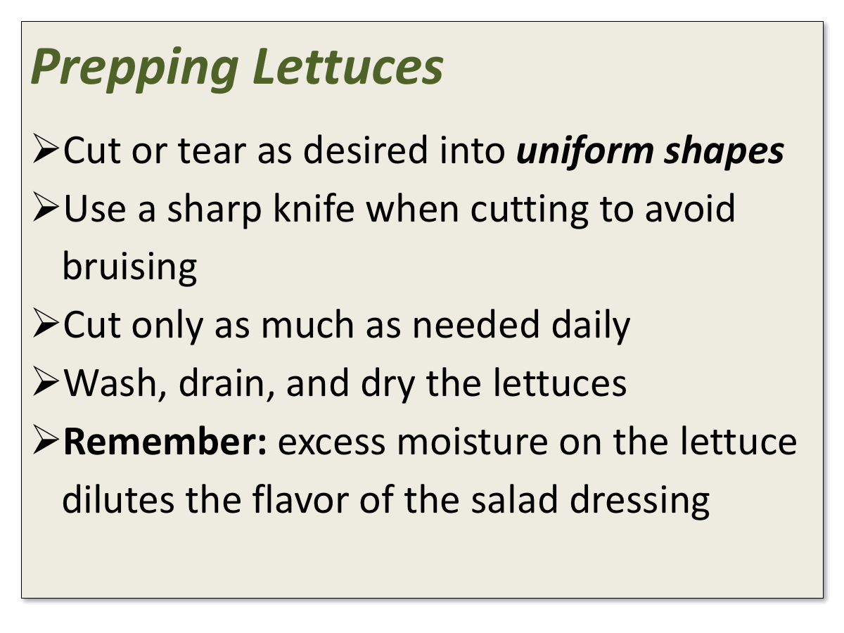 Lettuces are cut or torn depending on preference, usually before cleaning. If cutting, make sure the knife is sharp to avoid excess bruising. For the best appearance, process them to a uniform size. Since the lettuces and other leafy vegetables deteriorate quickly, process only as much as needed for a shift or the day.