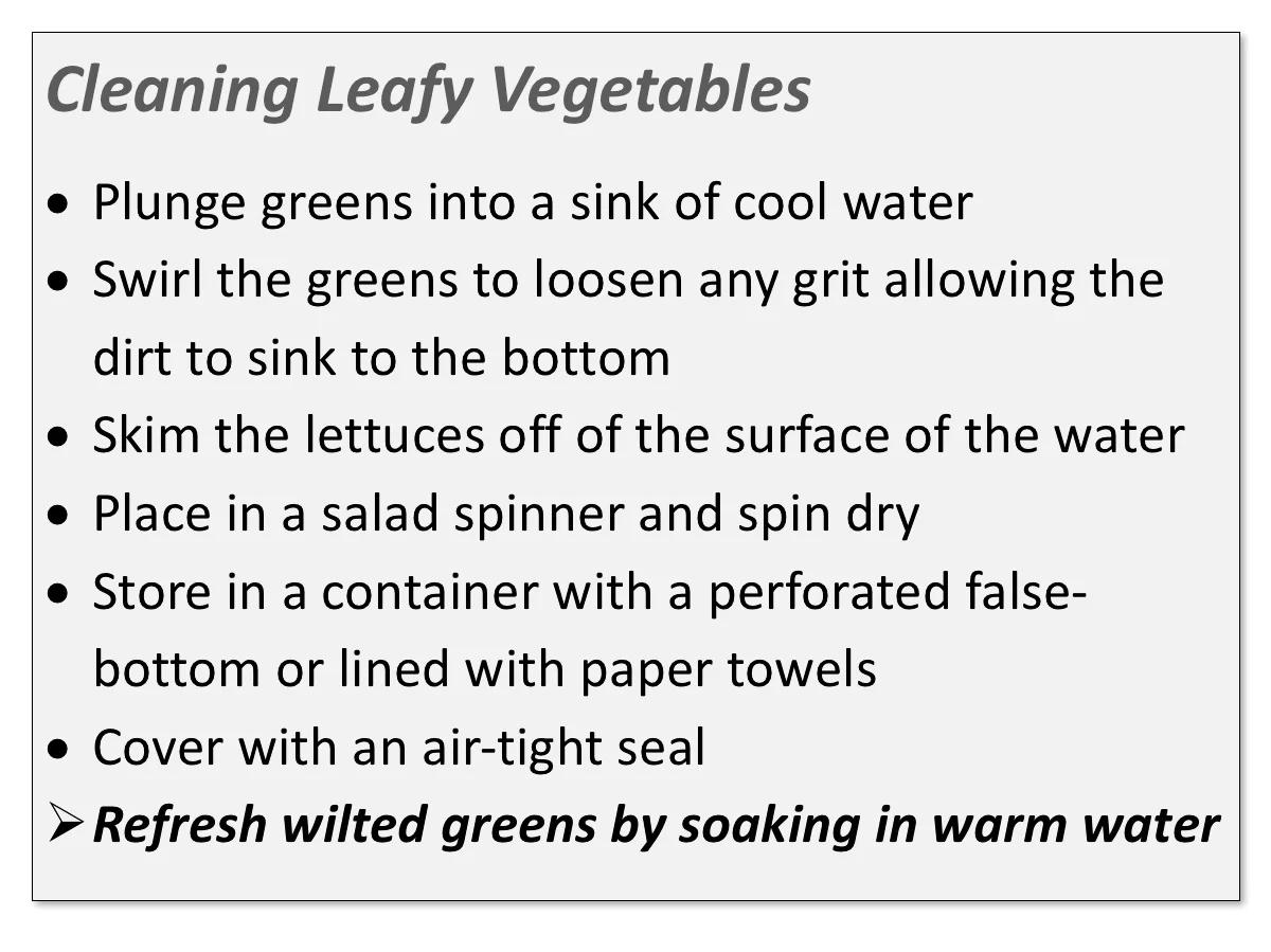 Lettuces often trap grit and dirt within their folds, requiring special attention when cleaning and cutting. Wash all greens before service (some varieties are processed and pre-washed, requiring no further cleaning). To properly clean lettuce, plunge them into a sink full of cool water; add a small amount of ice if desired. Swirl the greens to loosen any grit, allowing the dirt to sink to the bottom. The salad can then be easily skimmed off the top of the water. This process may need to be repeated up to three times, depending on the amount of grit in the lettuce. If the lettuces are slightly wilted, allowing them to sit in warm water will help to revive them.
