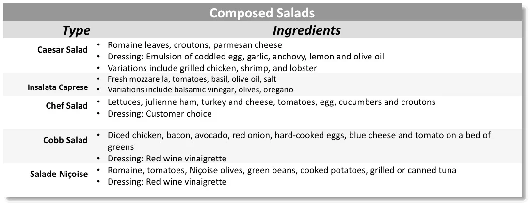 In French cuisine, a Salade Composée is an assortment of ingredients arranged aesthetically on a plate. The ingredients provide complementary and contrasting flavors, textures, and colors. They include cooked proteins like grilled chicken, shrimp, or tuna. The salad is often dressed tableside. Many entrée salads, including Cobb Salad, Salade Nicoise, and Caesar Salad, are variations on composed salads. A successfully composed salad has a balance of colors, flavors, and textures. It frequently includes lettuce, cooked or raw vegetables, meat, poultry or fish proteins, eggs, cheese, potatoes, or beans. Although the dressings are regularly olive oil-based vinaigrettes, other variations can be considered as well.