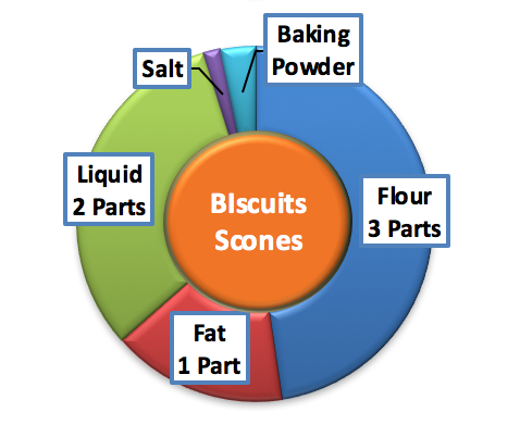 The biscuit-method, also used for scones, is prepared by sifting together the dry ingredients including flour, salt, sugar, and baking powder, the fat is then cut into the dry ingredients, and the mixture is folded together with the liquid producing a dense yet flakey texture.