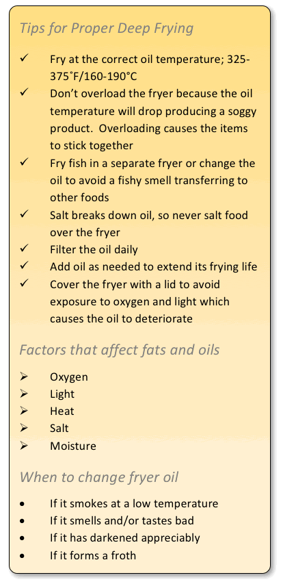 Deep frying is submerging food in hot oil at a temperature between 325-375˚F/160-190°C. When food is surrounded by hot fat, the surface quickly seals, preventing moisture from seeping out of the product. Successful deep frying produces a crisp texture and a moist cooked filling on the inside.