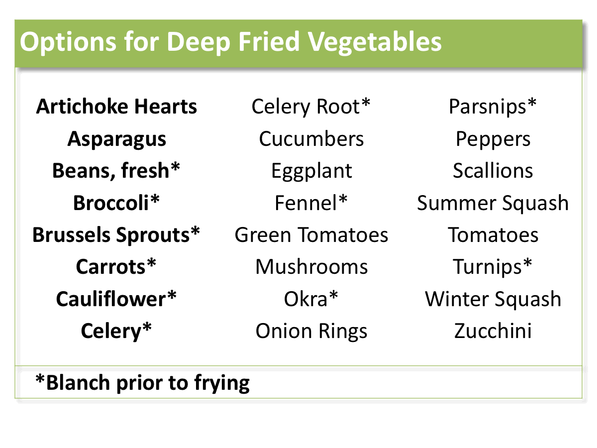 Frying vegetables produces a crisp texture with a caramelized taste. It uses more fats or oils in the cooking process than sautéing and is divided into Pan-Fried and Deep-Fried. Vegetables cooked using these methods are often coated with breading or are batter dipped to create fritters, tempura. The product may be pre-cooked or par-cooked before being finished by frying. Proper oil temperature is essential to evenly cook the product and provide a crisp texture and a golden color. Too much heat will overcook the coating while leaving the vegetables cold or raw. Too little heat, and the product will be soggy and oily. For most frying methods, a temperature of 325-350˚F/160-180˚C is ideal.